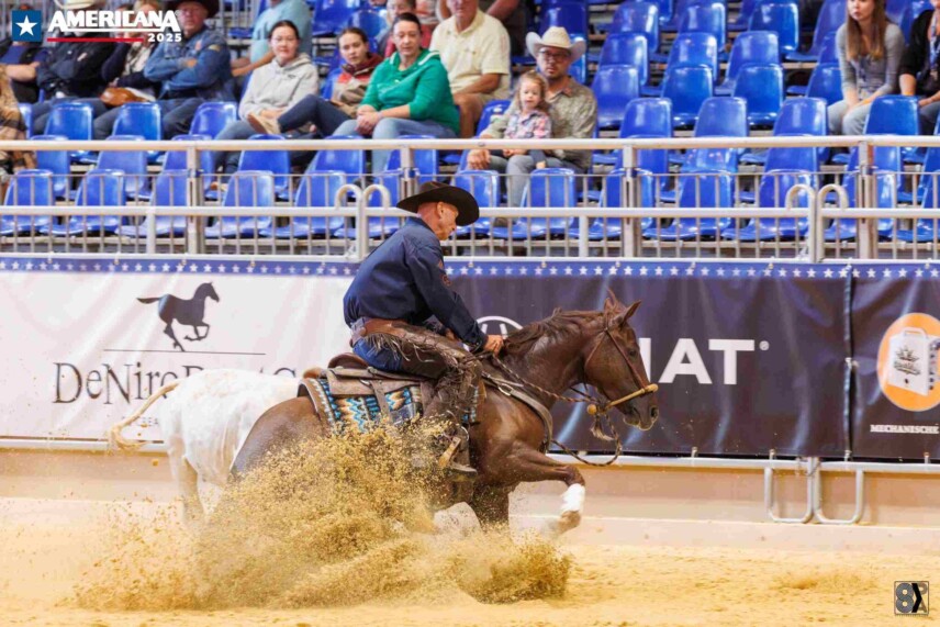 Im Open und Ltd. Open Bridle Spectacular stand die nächste Teilprüfung an: die Rein Work. Hier setzte sich Markus Schöpfer mit Metallics Journey (Metallic Cat x Smart Littlechet) im Besitz von Magnus Gustafsson mit einer 210,5 durch. Zusammen mit seiner 217 aus der Herd Work brachte er es auf einen Gesamtscore von 427,5, was die Führung in der Zwischenwertung bedeutet. Der 10-jährige Hengst brillierte bereits 2023 unter seinem Besitzer auf der AMERICANA im Non Pro Bridle Spectacular.
